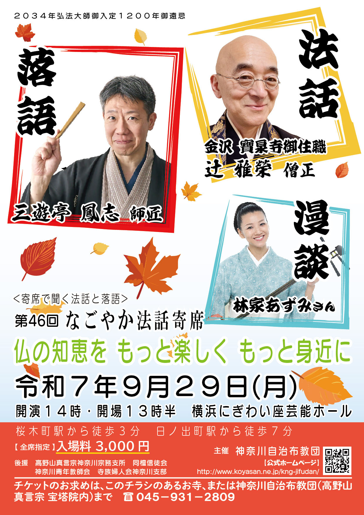 9月29日(月)14時より、横浜にぎわい座演芸ホールにて第46回なごやか法話寄席が開催されます。